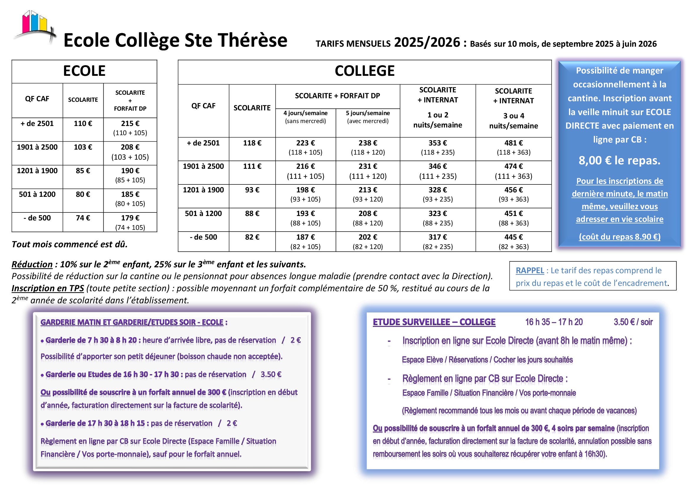 • L’assurance scolaire et extra scolaire obligatoire pour tous les élèves (St Christophe au prix de 7 euros/an et par enfant).